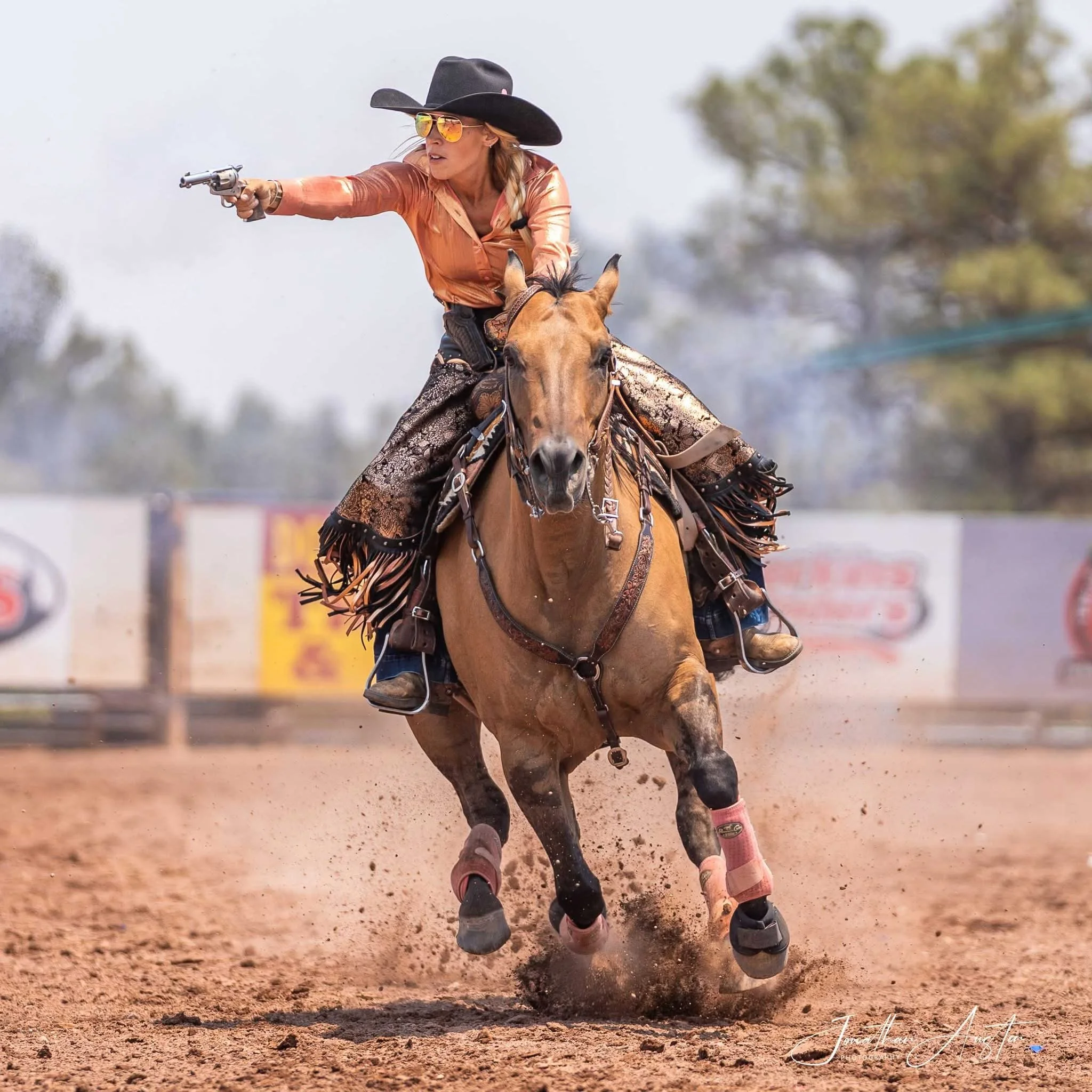 Mounted Shooting is a timed event on horseback where the rider and horse navigate a course of fire with 2, .45 caliber, single action revolvers, loaded with black powder blanks.